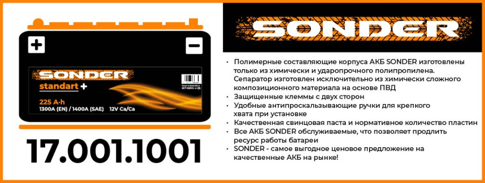 Аккумулятор Standart+ 225Ah 1300А + слева 518x276x242, (Sonder)