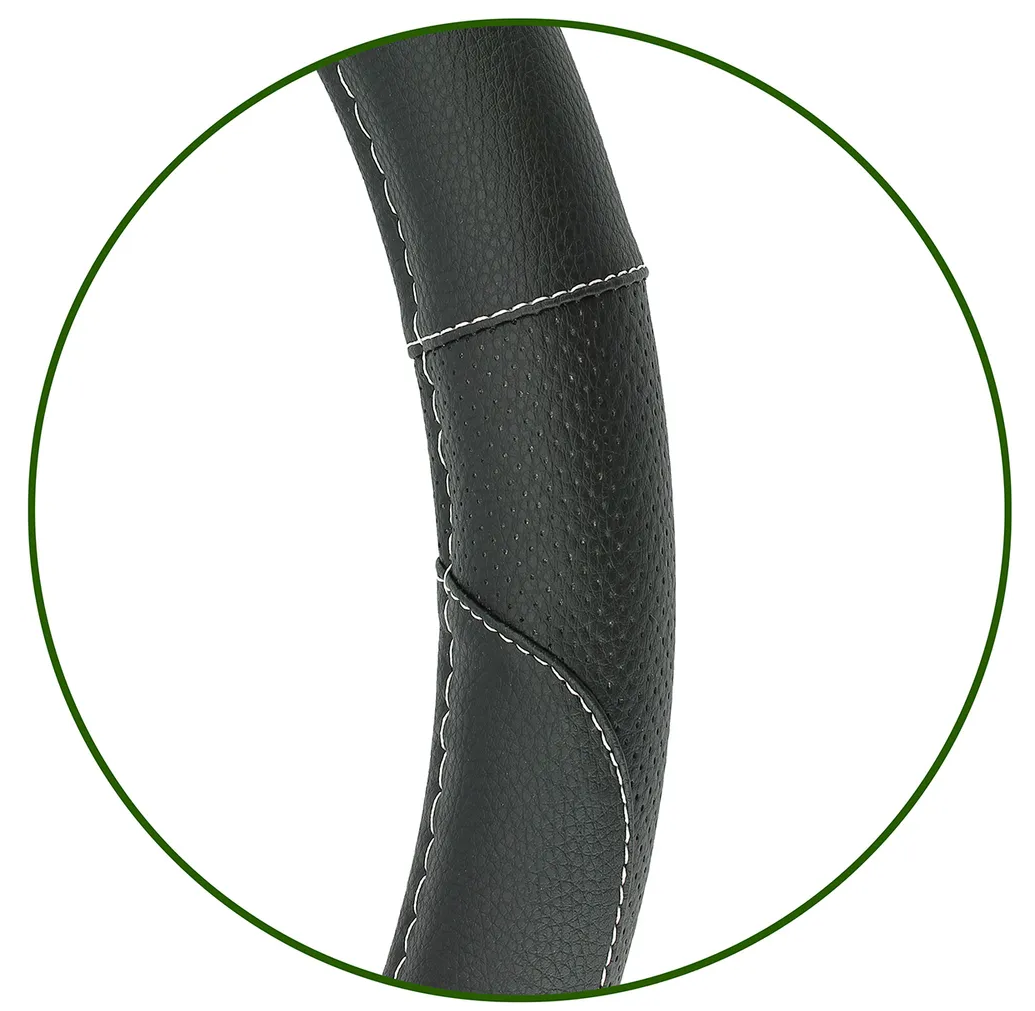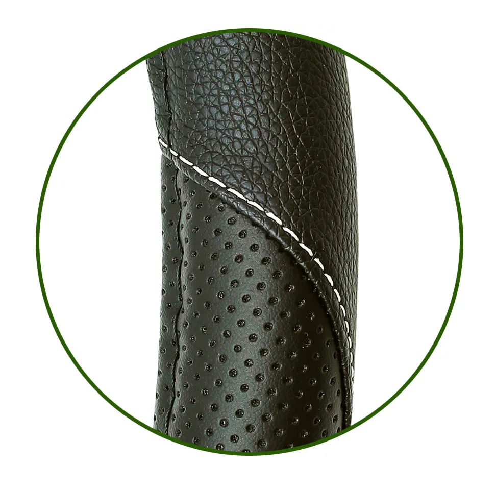 Оплетка изготовлена из натуральной кожи, что обеспечивает долговечность и прочность. Перфорация на поверхности оплетки обеспечивает вентиляцию и предотвращает скольжение рук во время вождения.