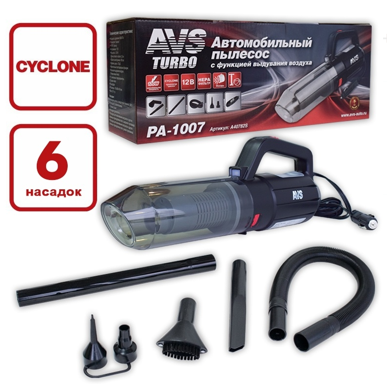 Пылесос автомобильный с функцией выдува AVS PA-1007 (6 насадок, фонарик)