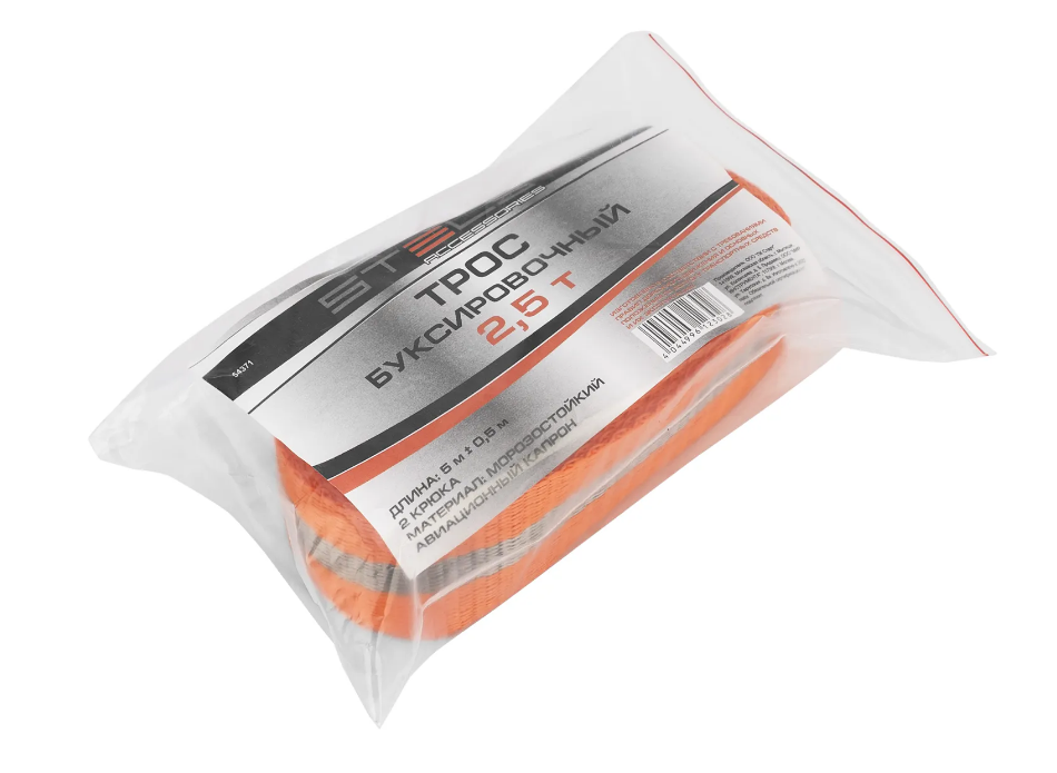 Трос буксировочный Stels 2,5 тонны – это надежный и качественный аксессуар для вашего автомобиля. С его помощью вы сможете быстро и безопасно эвакуировать свой автомобиль в случае необходимости.