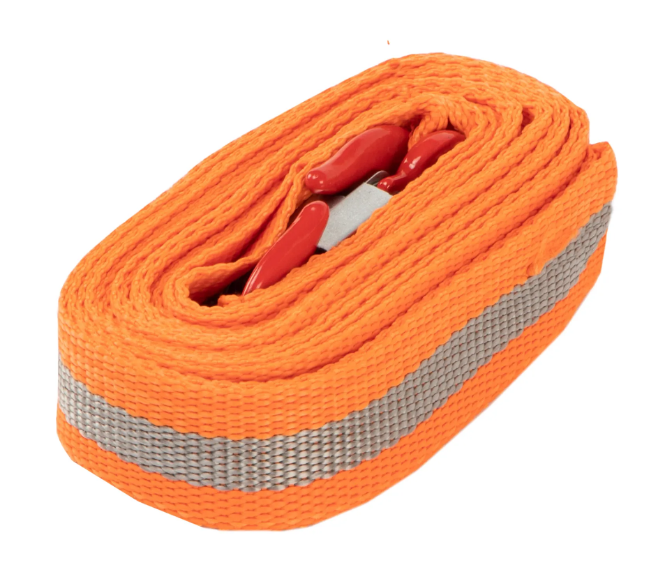 Трос оснащен двумя крюками (шаклами) для надежного крепления к автомобилю и буксируемому объекту. Вид троса – ленточный, что обеспечивает удобство использования и простоту крепления.