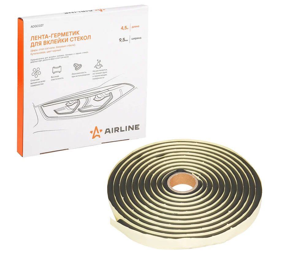 Лента-герметик AIRLINE имеет ширину 9,5 мм и длину 4,5 метра, что позволяет использовать ее для вклейки различных элементов автомобиля, таких как фары, стоп-сигналы и боковые стекла.