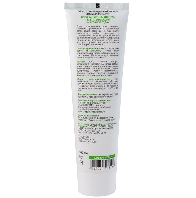 Крем защитный для рук регенерирующий марки "Чистая звезда", туба 100мл