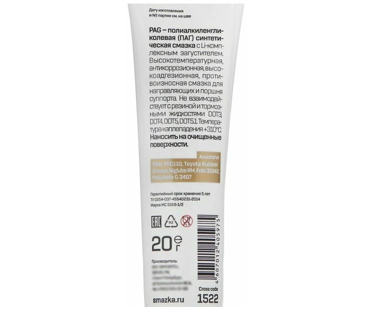 Смазка для суппортов PAG (20г), туба ВМПАВТО