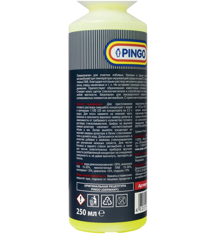 Выбирая концентрат для стекол PINGO, вы получаете эффективное и безопасное средство для очистки стекол автомобиля, которое обеспечивает отличную видимость и защиту от загрязнений.