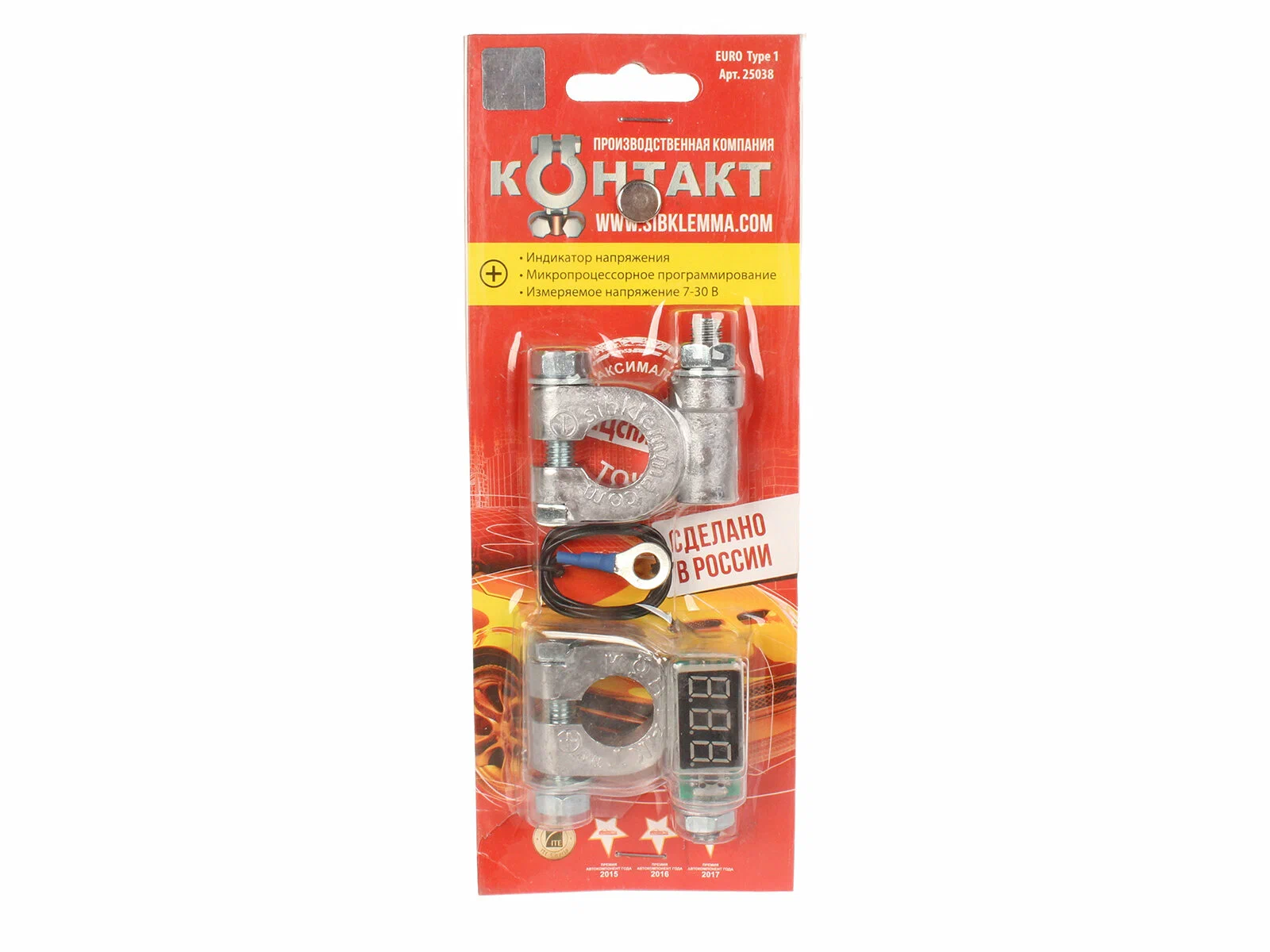 Клеммы акб грузовая "контакт" (под болт) с вольтметром — устройство, предназначенное для надёжного соединения аккумуляторных батарей и контроля их напряжения в электросистемах двигателей.