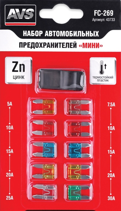 Набор предохранителей avs fc-269 "мини" в блистере — компактный комплект плавких предохранителей, предназначенный для быстрого и надёжного отключения электрических цепей при превышении допустимого тока.