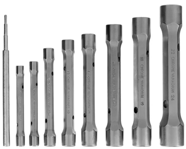 Основные характеристики набора включают девять трубчатых ключей размером от 6 мм до 24 мм. Все ключи изготовлены из стали, что повышает их прочность и устойчивость к износу. Материал CrV, используемый в производстве, гарантирует отличное качество изделий, а также долговечность в условиях высокой нагрузки.