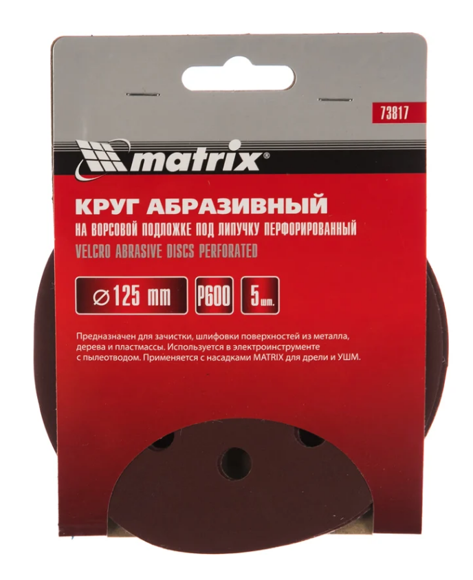 Круг абразивный на ворсовой подложке под липучку (125 мм, Р600, 5 шт.) MATRIX 73817