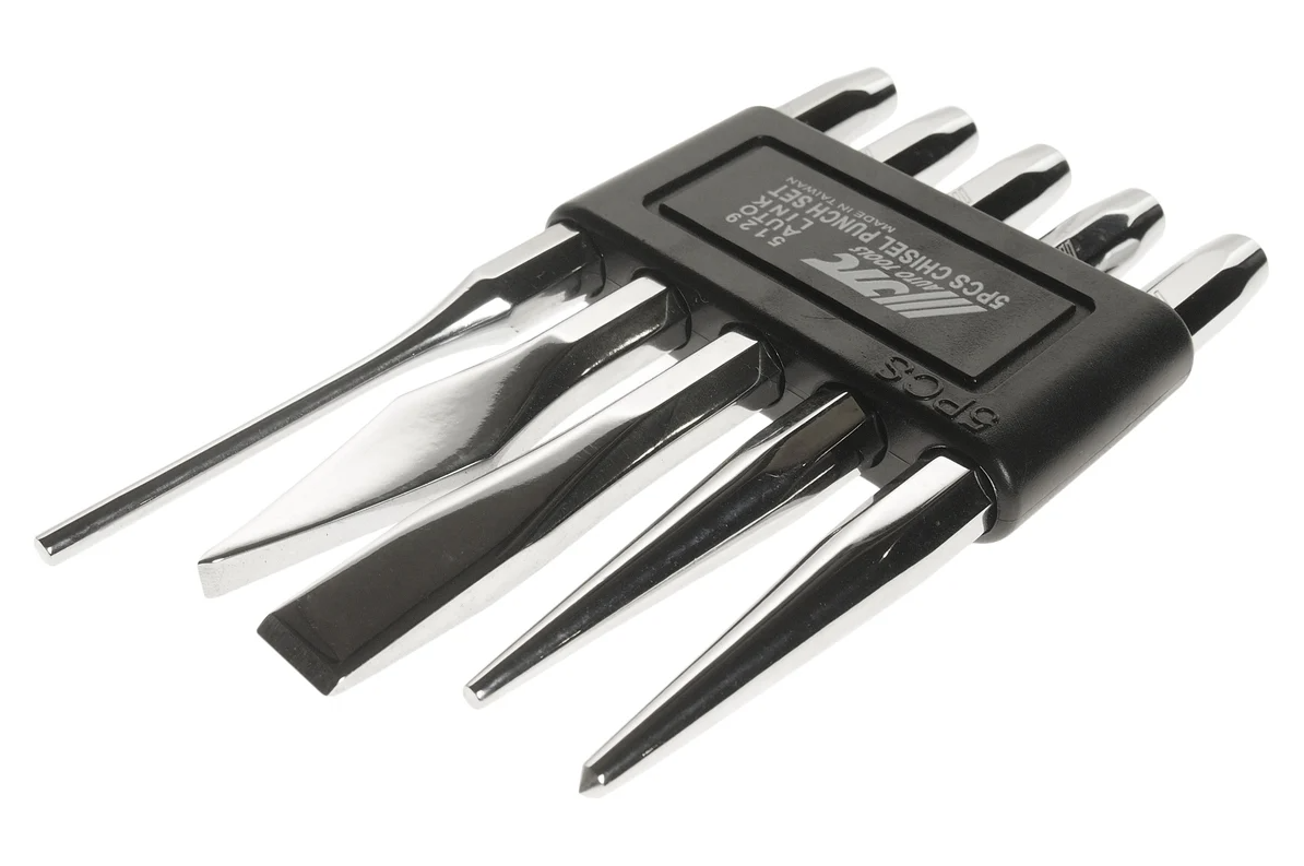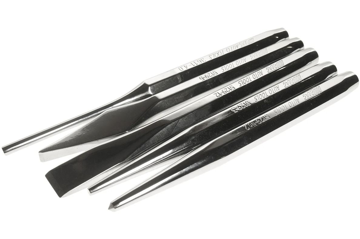 Набор выколоток и зубил с кернером JTC AUTO TOOLS - это профессиональный инструмент, который включает в себя 5 предметов, упакованных в удобный кейс.