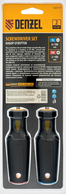 Набор отвёрток Denzel представляет собой высококачественный инструмент, который станет незаменимым помощником как в быту, так и на производстве. В комплект входят две отвертки с разными типами наконечников: PH и SL, что позволяет использовать их для работы с различными видами крепежа.