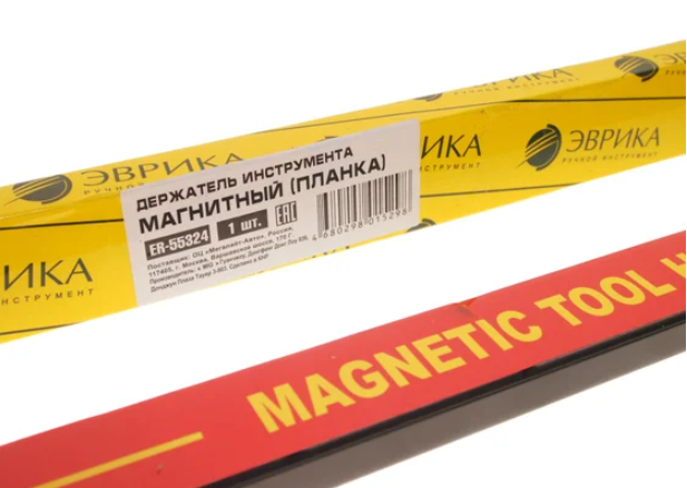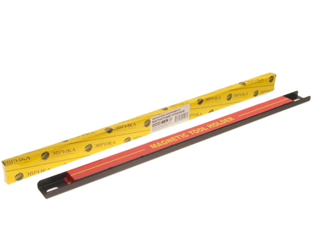 Длина планки составляет 457.2 мм, обеспечивая достаточную поверхность для размещения ключей, отверток и прочих мелких приспособлений. Магнитная поверхность фиксирует металлические элементы, предотвращая их падение. Изготовлен под маркой Эврика, известной качественными аксессуарами для автосервисов.