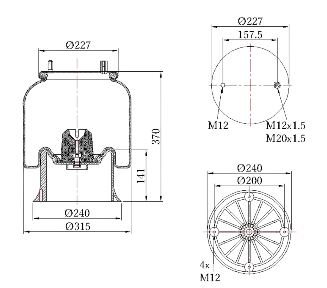 Пневморессора со стаканом (пластик) 1шп.-M12 + 1шп.-штуц.-M12/20 (стакан 4 отв.xМ12) (Sonder)